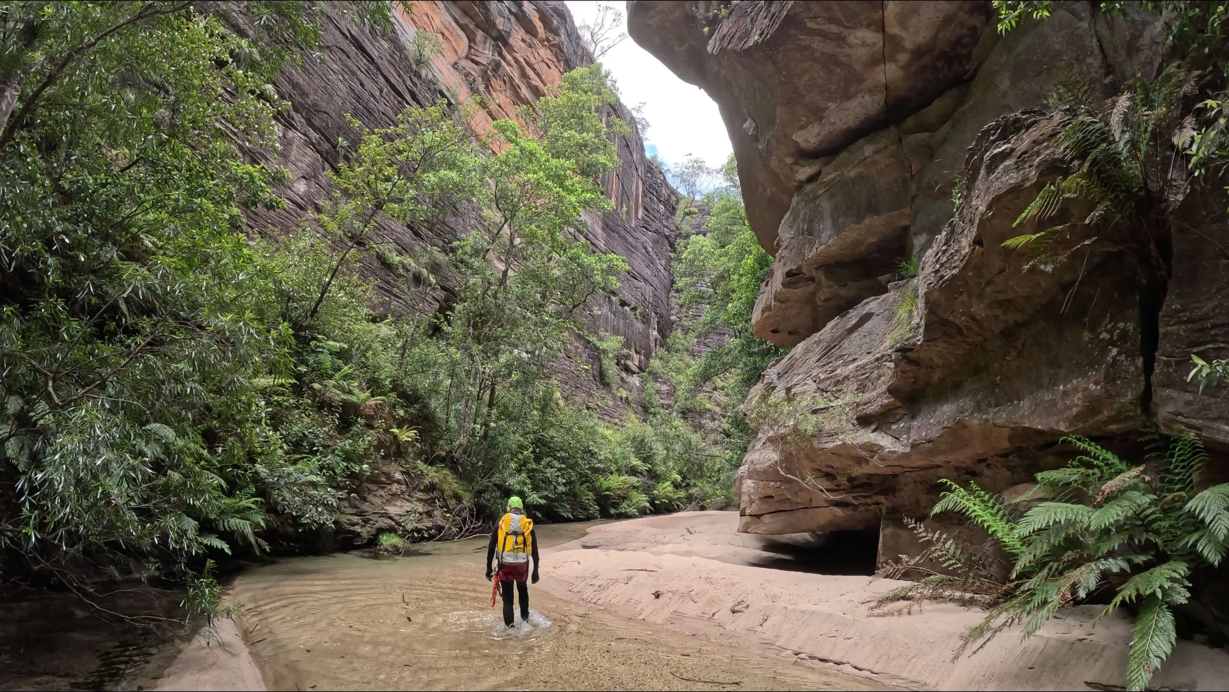 Mt Wilson has many and varied landscapes. We start in the Blue Mountains Basalt Forest, an Endangered Ecological Community, that only thrives on the rich volcanic soils , then descend through typical Blue Mountains sclerophyll forest towards the Wollangambe River, over rock pagodas and past rugged canyon cliffs. An optional side trip can be taken in knee deep water through a short but spectacular slot canyon – you’ll get a taste of the canyoning experience without getting too wet or needing ropes. Have brunch at a beautiful river beach where you can explore for a while, swim, or just take in the serene surroundings. Return the same way, or if you’re feeling adventurous there is a more direct route.